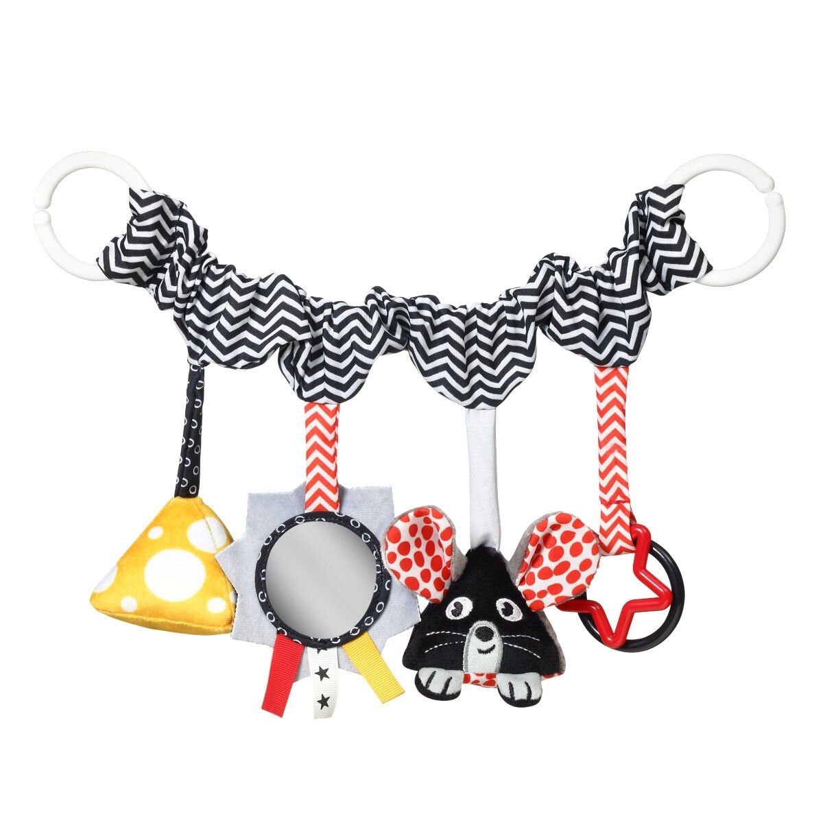 Babyono kontrastingas „Sūris ir Pelė“ yra sensorinis žaislas, skirtas stimuliuoti vaiko lytėjimo ir regėjimo pojūčius bei motorikos įgūdžius. Pritvirtinkite jį prie vežimėlio, lovelės ar automobilinės kėdutės, kad jūsų kūdikis būtų linksmas pasivaikščiojimų ar kelionių metu. Ant švelniu audiniu yra pakabinti keturi elementai: barškanti geltono sūrio dalis, saugus veidrodis su spalvingais žymėmis, pelė su šlamščiančiomis ausytėmis bei apskritimo ir žvaigždės kontūras. Įdomus elementų pasirinkimas skatina tyrinėjimą ir traukia vaiko dėmesį įvairiais dizainais ir didelėmis kontrasto spalvomis. Žaisdamas kūdikis pažins pasaulį, lavins akių-ausų koordinaciją.