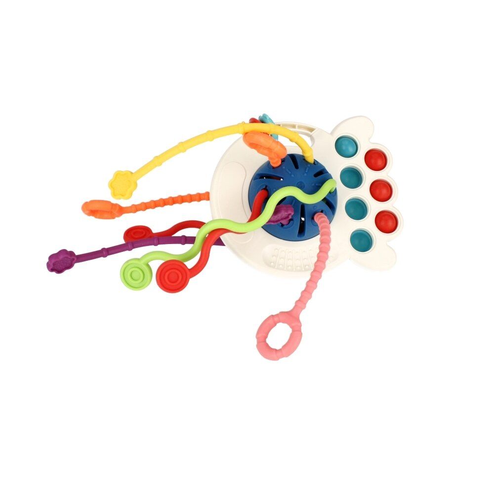 Ant aštuonkojo pritvirtinta 6 minkšti silikoniniai rankogaliai, nuostabių spalvų, o tempiami iš vienos pusės į kitą ilgam laikui sudomina mažylį, suteikdami jam daug priežasčių juoktis, kartu lavindami jo rankų motorikos įgūdžius ir smulkiąją motoriką.