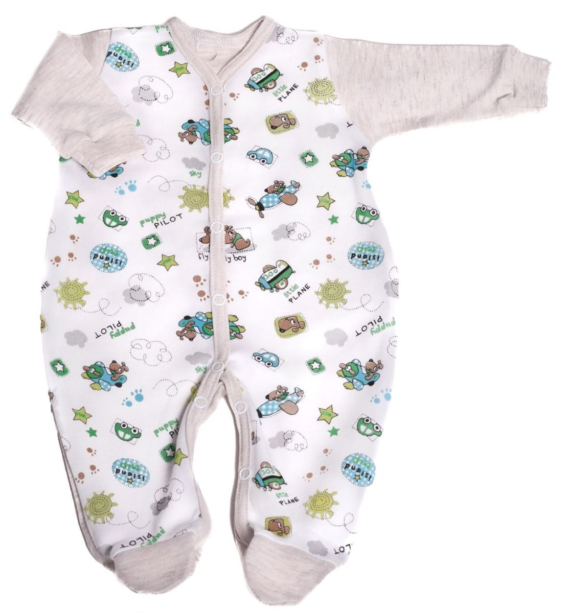 Kirjeldus Beebi tudukombe - romper "Pilot" valge puuvill värviliste lennukitega