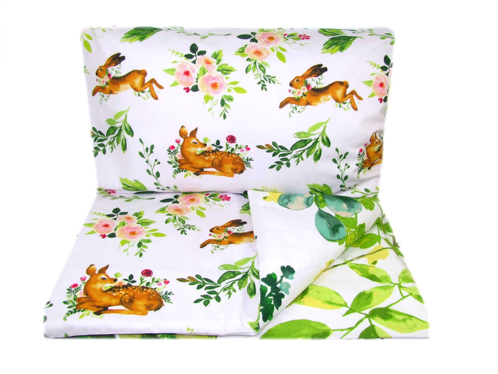 Kirjeldus Beebi voodipesu 135x100 "GAZELA" üks pool hirvedega, teine roheliste lehtedega.