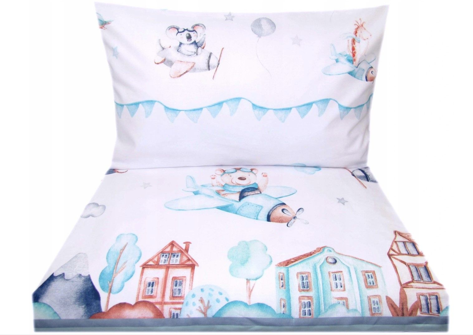 Kirjeldus Beebi voodipesukomplektid 100x135 "Aircraft" piparmündi dekoratiivjoonega.