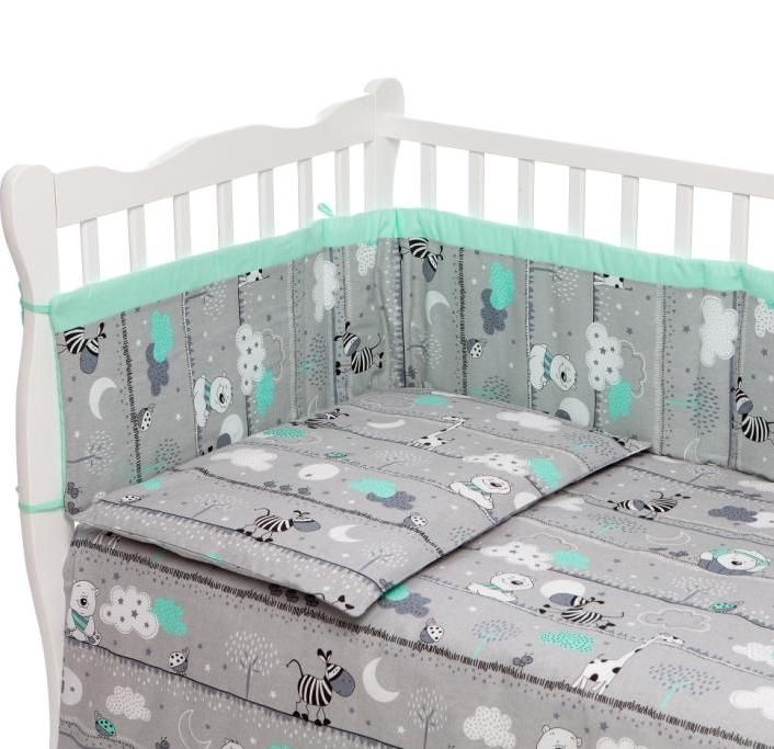 Kirjeldus Beebi voodipesu koos voodipehmendus "Safari" türkiissiniste (sebra ja karu)