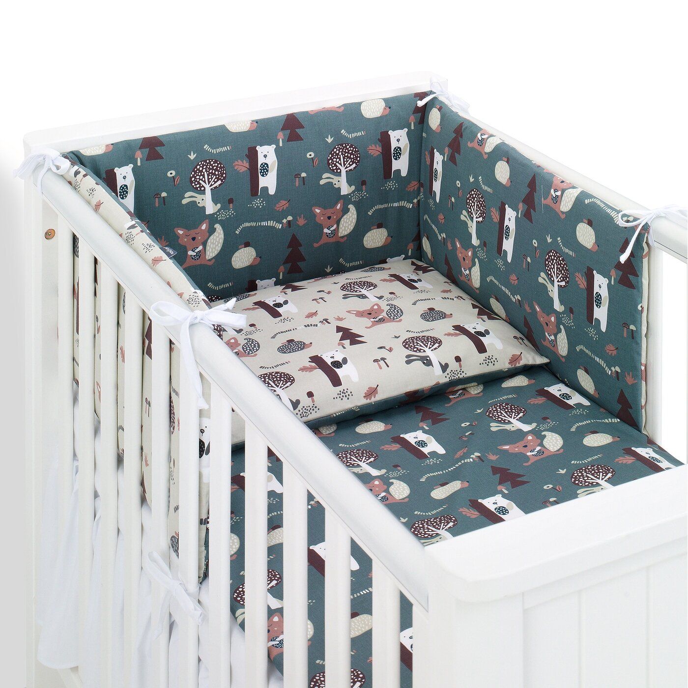 3. Lovytės apsauga 30x190cm su nuimamu užvalkalu. Gali būti naudojama iš abiejų pusių. Apsauga turi 8 ilgus, gerai prisiūtus diržus, kurių dėka ją galima tvirtai pritvirtinti prie lovelės.