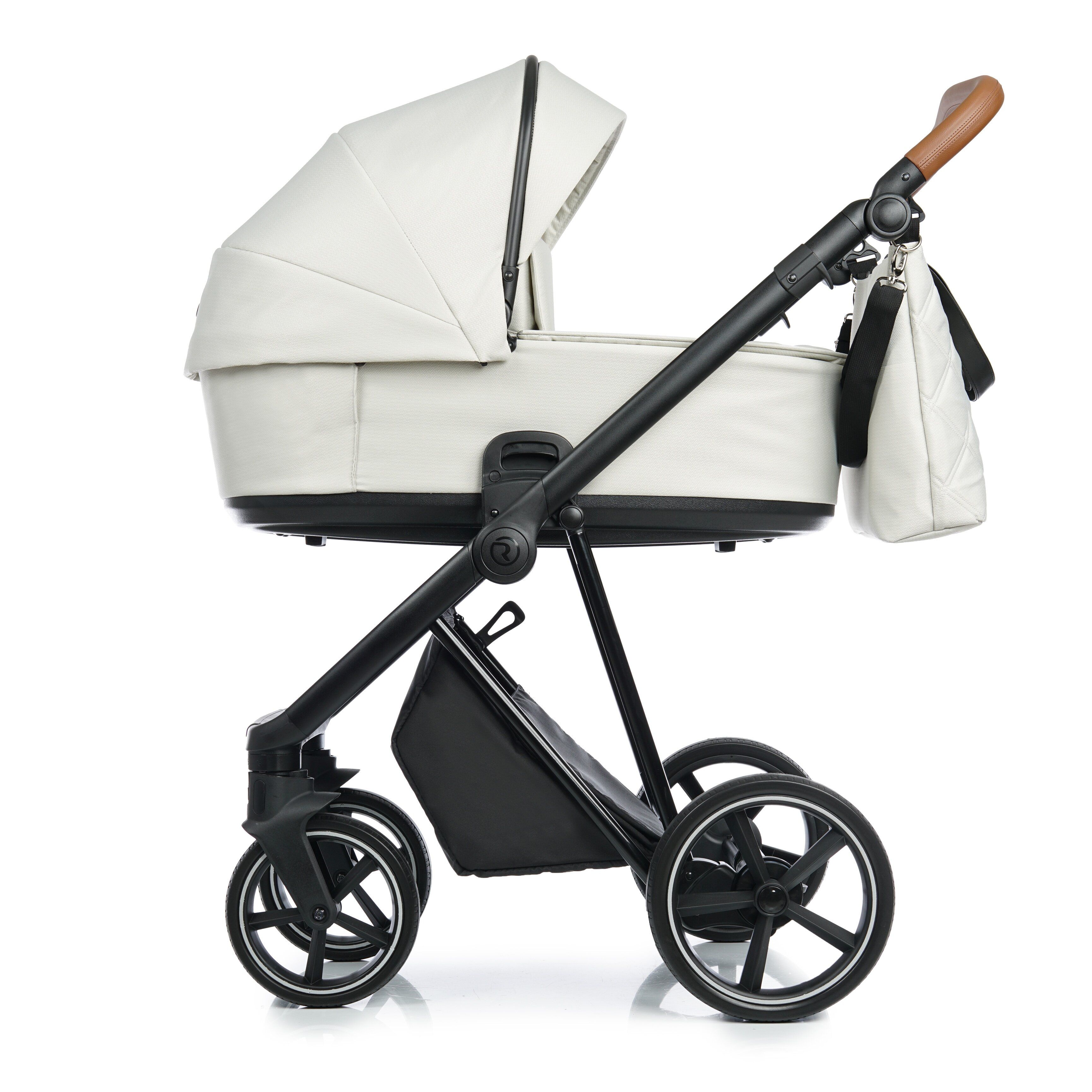 Reguliuojama rankena apsiūta EKO oda. Lengva ir patogi „Click“ sistema, skirta montuoti lopšį, vežimėlį ir auto-kėdutę.