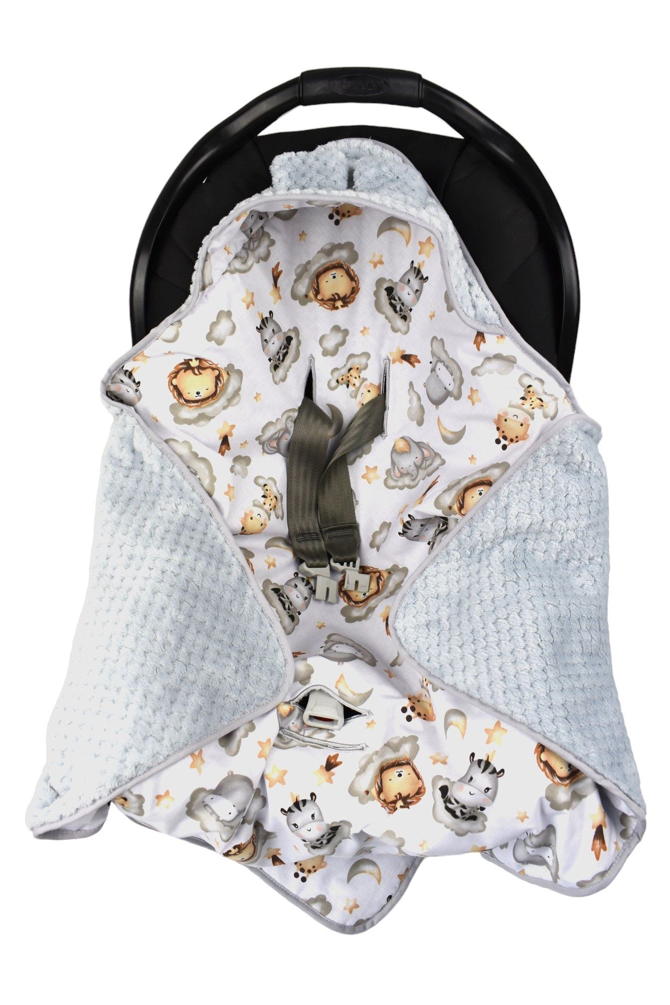 Одеяло для автокресла совместимо с большинством автомобильных сидений, подходит для сидений 0-13 кг с 3-точечными ремнями безопасности.