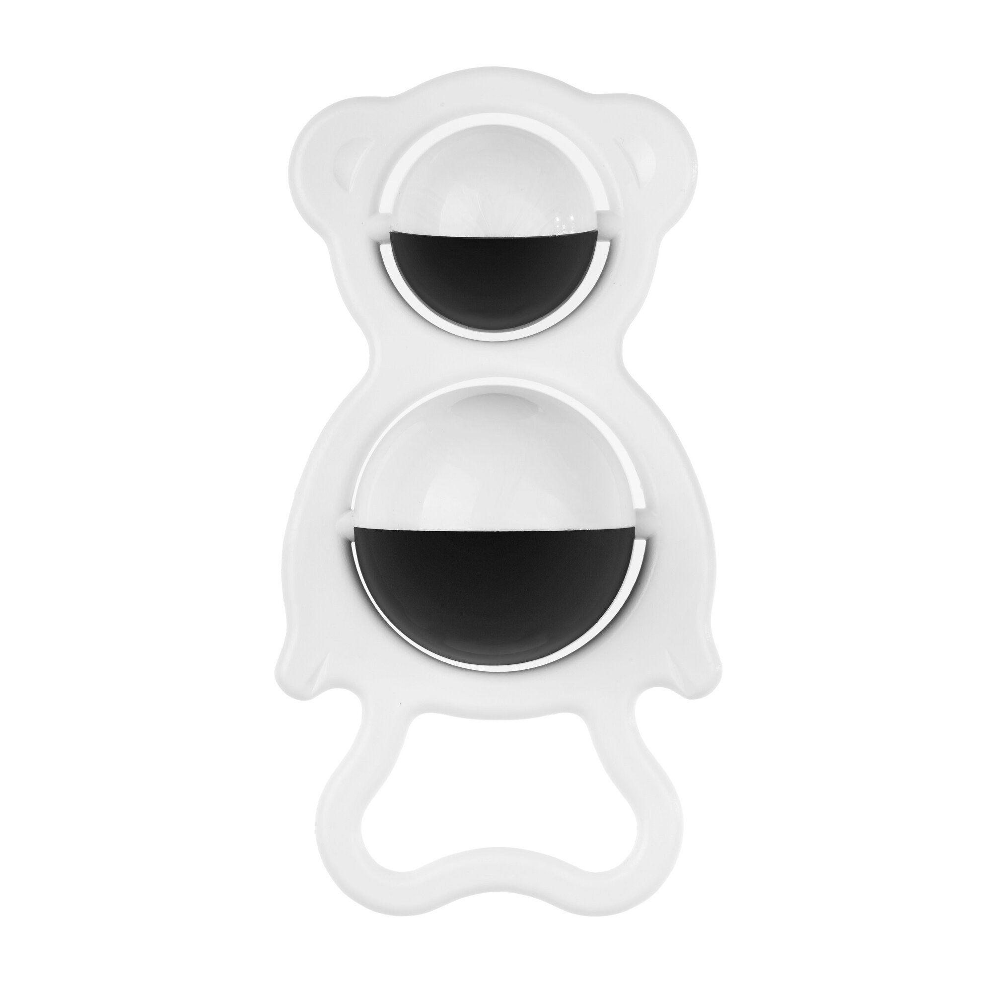 Gražus juodai baltas barškutis skirtas kūdikiams. Toks spalvų derinys puikiai stimuliuoja kūdikio, kuris dar neskiria spalvų, regėjimo pojūtį.